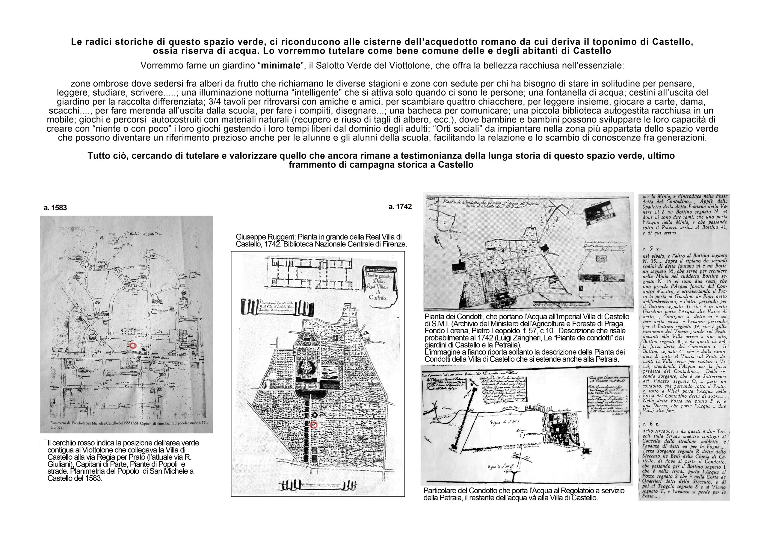 Questo progetto nasce dal bisogno della comunità di Castello di avere uno spazio verde pubblico ed autogestito. Infatti, ogni cosa presente nel giardino è mantenuta o costruita dagli abitanti del rione e dai membri del gruppo dei custodi.